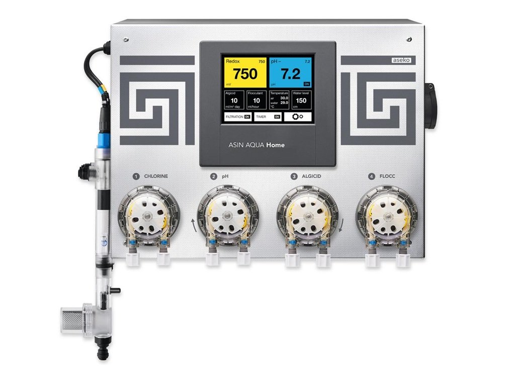 ASIN AQUA HOME - REDOX = komplexné riešenie pre Váš luxusný bazén. Jednoduchá inštalácia, bezúdržbová obsluha, nízke náklady na údržbu, zabráni predávkovaniu chlórom. Nemeria obsah chlóru ale dezinfekčnú úroveň pomocou tzv. REDOX potenciálu ORP. Súčasťou prístroja sú 2 meracie sondy (ORP, pH) a štyri dávkovacie čerpadlá.