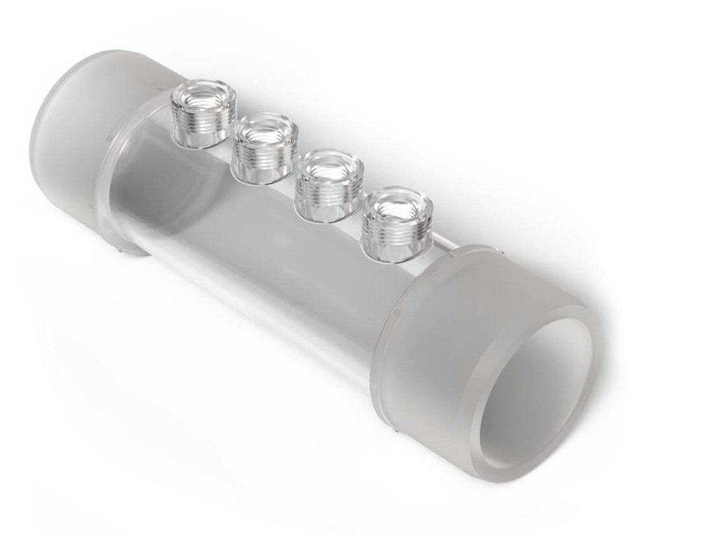 Vlepovacia armatúra má univerzálnu veľkosť d50/63. Do predvŕtaných závitov je možné jednoducho naskrutkovať nástrekové ventily, uzatváracie ventily a nádržku teplomeru. Nepoužité závity sú utesnené zátkou.