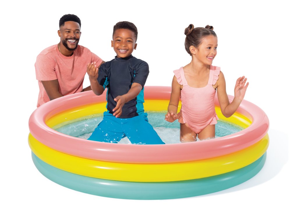 Nafukovací bazén pre deti od 2 rokov s mäkkým nafukovacím dnom. Stenu tvoria tri rôznofarebné kruhy.